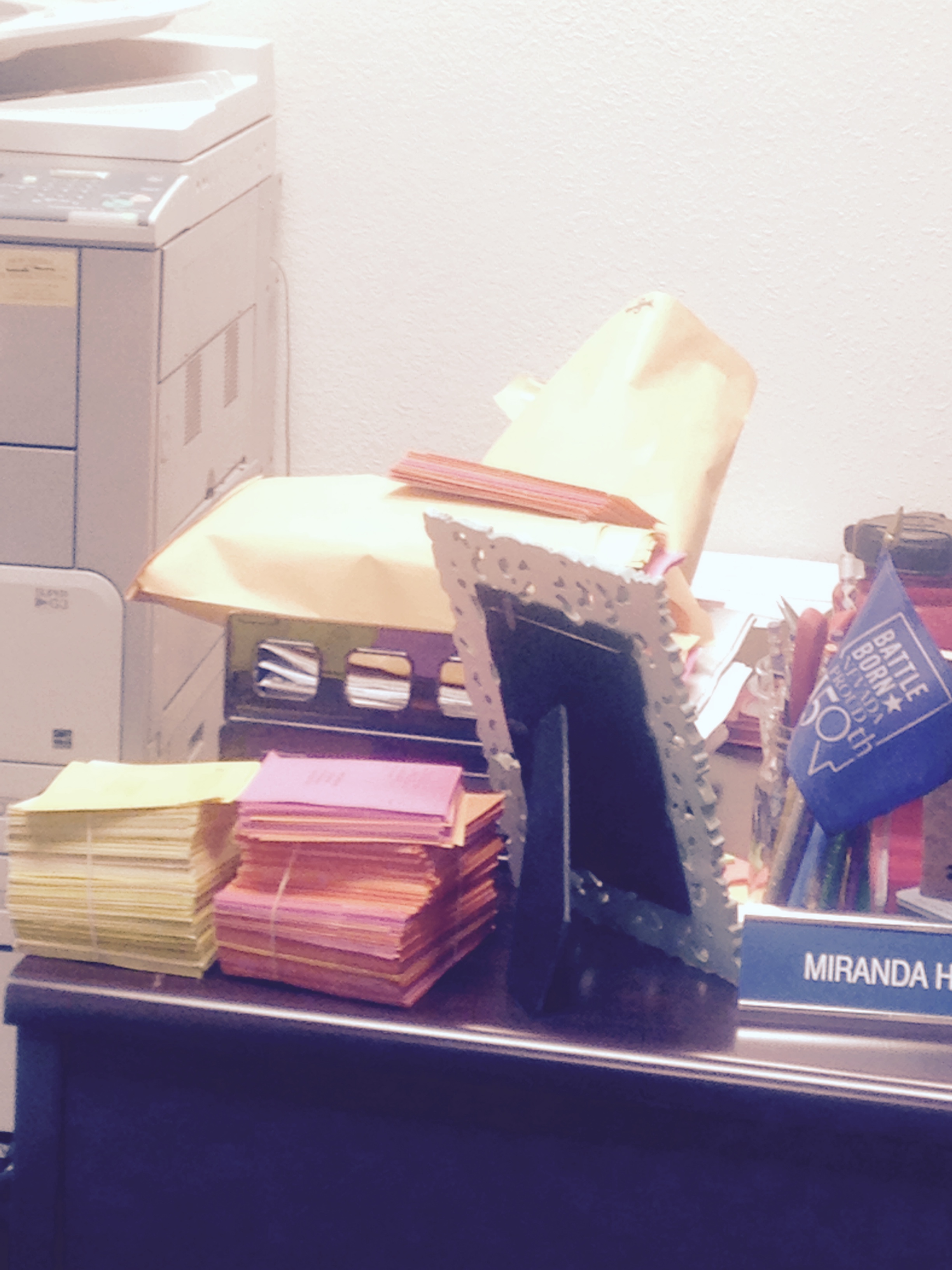 Today, I am opening with a shout-out to all of our community organizers, big and small. Some of the smaller ones have had the opportunity to learn old-school tactics. Emails are great. Calls are great. Visits are wonderful, but nothing says activism like a pile of thousands of postcards. Hey little Bridges, those postcards you put in your mailbox in Las Vegas ended up on the desk above MAKING A DIFFERENCE. Good work gentlemen!