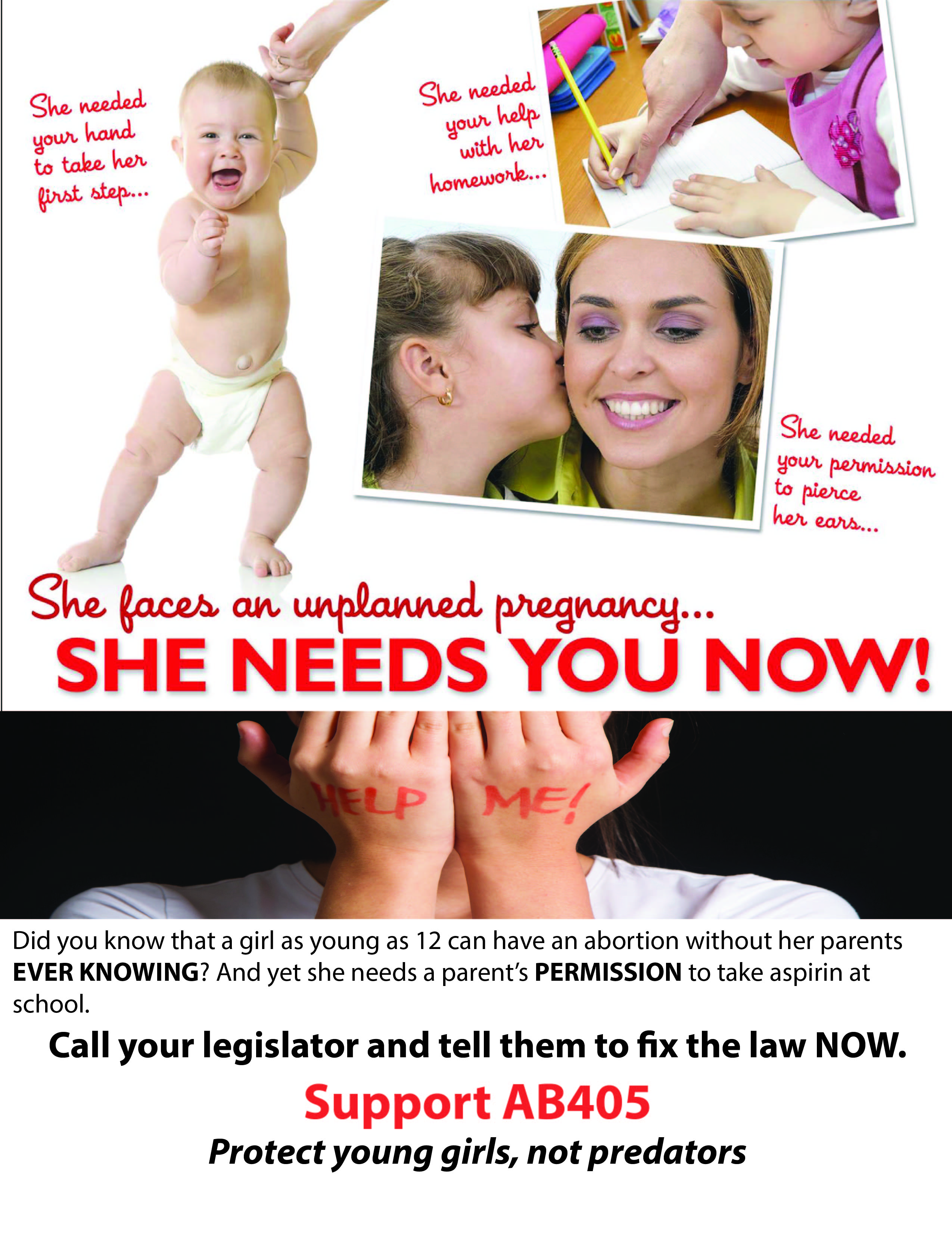 If AB405 fails to get a hearing this session, two people will get credit for spiking a common sense parental notification law – a form of which already exists in 38 other states. Girls as young as 11 or 12 will not be able to sign a contract for a phone, get her teeth cleaned, go on a school field trip, get her ears pierced, get an aspirin at school or get a tattoo without a parents consent. Yet that same LITTLE girl will be able to get an abortion, an invasive surgical procedure, without a single parent or guaredain ever KNOWING.